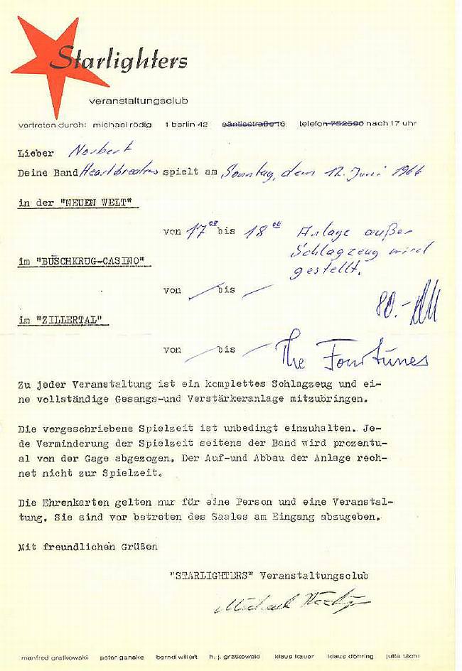 Wer oder was waren die Starlighters? "Michael Rödig — ein sympathischer, mit ausgesprochenem Organisationstalent begabter cleverer junger Mann — scharte vor zwei Jahren ehemalige Mitschüler und Freunde seiner vom Zerfall bedrohten Jugendgruppe um sich, fand mit Hilfe eines Grafikers den zugkräftigen Namen, „Starlighters", gründete unter dieser Firmierung seinen Klub und stellte sich die Aufgabe, künftig das in die Hand zu nehmen, was der weisungsgebundene Leiter eines Jugendheimes erst nach Überwindung erheblicher Schwierigkeiten tun kann, nämlich Tanztees und gesellige vergnügte Partys für junge Leute zu arrangieren. Es ging gut voran. Die Billetts für alle diese Veranstaltungen wurden restlos ausverkauft. Einnahmen und Ausgaben balancierten sich aus. Die Buchführung wies die ersten nennenswerten Überschüsse auf; das ermunterte den kleinen Kreis der zehn Aktiven zu neuen Ideen. Rödig kalkulierte absolut legitim und richtig, daß sich seinen Plänen eine bessere Entfaltung bieten werde, wenn sich die „Starlighters" einem Jugendverband angliedern. Er spart dadurch nicht nur die erhebliche Vergnügungssteuer, sondern findet damit auch eine recht solide geschäftliche Basis. Den „Falken" wiederum kam sein Vorschlag sehr gelegen. Ihrem durch politische Eskalationen etwas durcheinander gebrachten Image verhalf der Beat zu einem neuen Make-up und führte ihnen beachtliche Mengen sympathisierender Fans zu. Seitdem arrangieren die „Starlighters" mit Rückendeckung der Funktionäre Tanzmeetings und Beatfestivals am laufenden Band. 40000 junge Berliner waren 1965 beiden Veranstaltungen der „Starlighters" zu Gast. An Jedem Wochenende strömen die Beatfans ins „Zillertal" und in das Buschkrug-Kasino, die beiden Veranstaltungshäuser der „Starlighters", und amüsieren sich, wie's ihnen geziemt — ganz ohne Krawall. Die Abrechnungen wurden vom Verbandsbüro kontrolliert, und da sie bis zur letzten Stelle hinter dem Komma korrekt sind, dürfen die „Starlighters" weiter vor Aktivität sprühen." Mehr dazu in dem Blickpunkt-Artikel aus derNr. 146 / 2-1966: Beat macht sich bezahlt (khs)